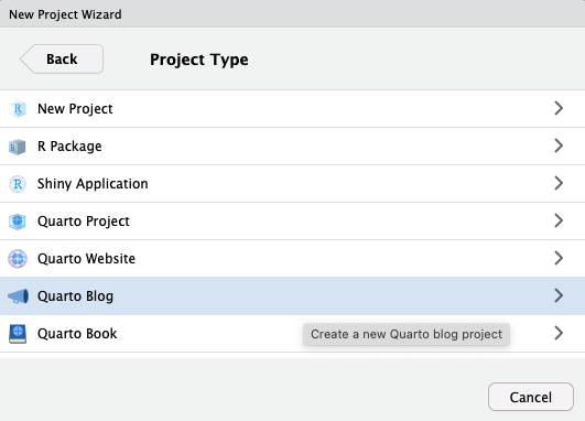 To create a new blog project within RStudio, use the New Project command and select Quarto Blog: